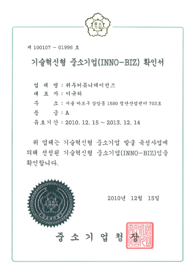 ㆍ 중소기업청 기업혁신형 중소기업(INNO-BIZ) 선정
