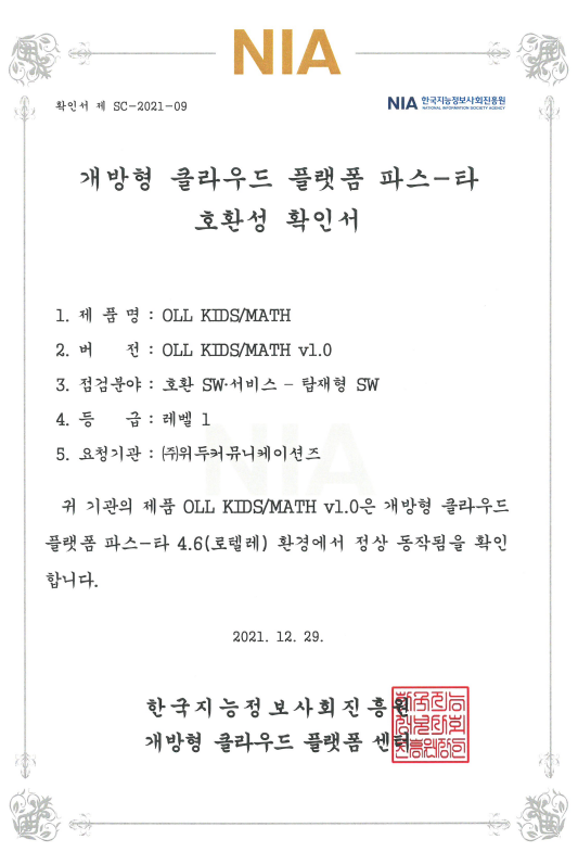 [한국/확인서] OLL KIDS/MATH 파스-타 호환성 확인서 페이지 정보 작성자 WeDu 댓글 0건 조회 10,476회 작성일 21-12-31 12:48 본문 2021-12-29 확인서 제 SC-2021-09 점검분야 : 호환 SW서비스 - 탑재형 SW List Next[한국/인증서] OLL KIDS/MATH 클라우드 서비스 확인서 21.12.31